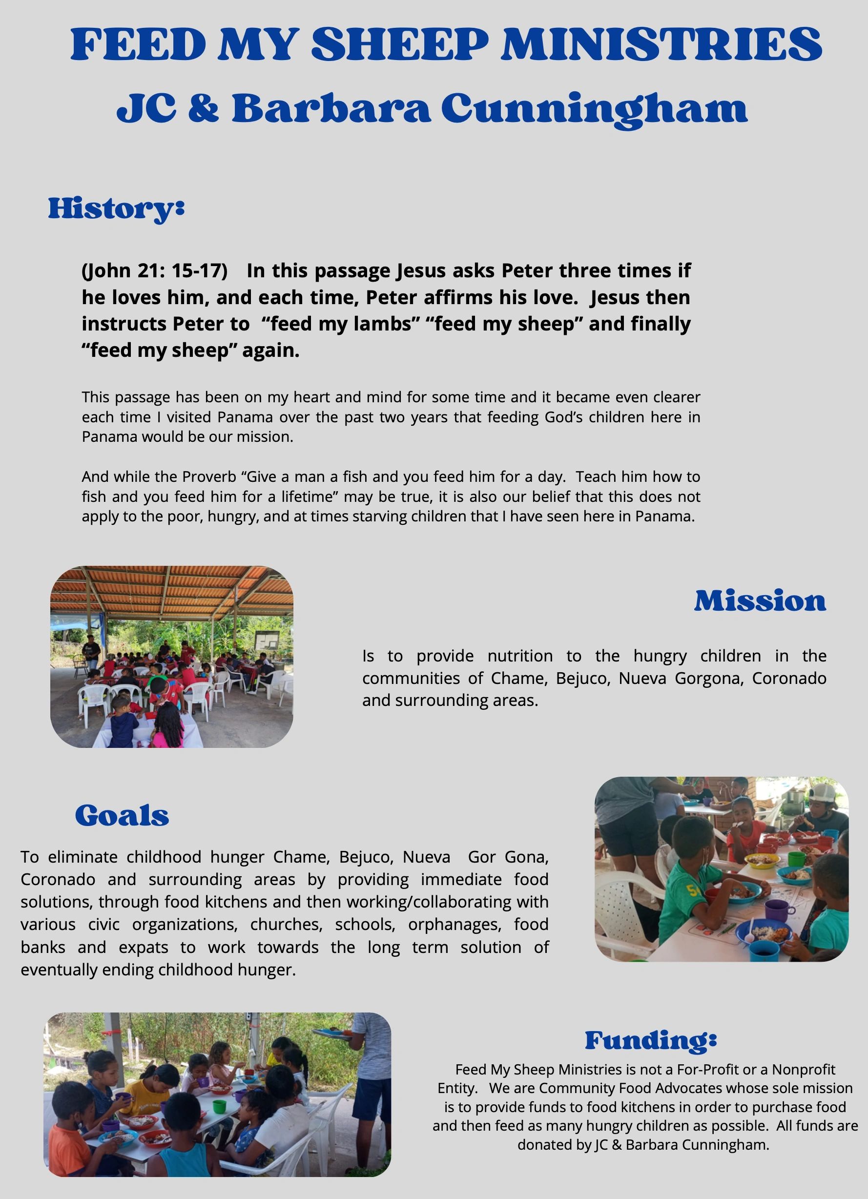 Feed My Sheep Ministries' sole mission is to partner with local Panamanian Churches and Organizations by providing funds to food kitchens to feed as many hungry children as possible.